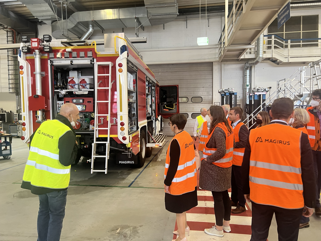 Wie ein maßgeschneidertes Feuerwehrfahrzeug entsteht, davon machten sich die Teilnehmerinnen und Teilnehmer am Ende selbst ein Bild: Beim Rundgang durch die Fertigung konnten sie am Ende nachvollziehen, warum es etwas länger dauert, solch ein Fahrzeug herzustellen. Denn tatsächlich gleicht keines dem anderen. Und jedes für sich ist vollgestopft mit allem, was man für den jeweiligen Einsatzzweck bei der Feuerbekämpfung braucht – ein echtes Meisterstück aus Ulm.