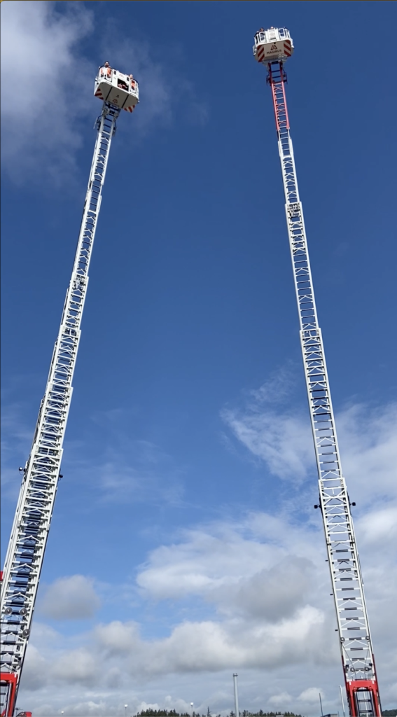 42 Meter ging es für die Teilnehmerinnen und Teilnehmer am Ende mit der Drehleiter hoch hinauf in den Himmel. Ein krönender Abschluss des Besuchs der Initiative Donautal-Connect bei Magirus, dem Marktführer für Feuerwehrdrehleitern und renommierten Hersteller von Löschfahrzeugen, Rüst- und Gerätewagen, Speziallösungen, Pumpen und Tragkraftspritzen. Das war zwar nicht ganz so hoch wie bei der Weltrekord-Drehleiter, die es auf stolze 68 Meter bringt. Doch „ab 32 Metern ist es egal, dann wird es nicht mehr schlimmer“, so Geschäftsführer Thomas Hilse augenzwinkernd.