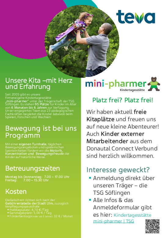 Gegründet wurde die Einrichtung 2005 in Kooperation mit der TSG Söflingen 1864 e.V., die bis heute Träger ist. Teva stellt die Räumlichkeiten auf dem Werksgelände bereit und ermöglicht mit flexiblen Öffnungszeiten und kurzen Wegen eine praxisnahe Unterstützung für Familien – auch über das eigene Unternehmen hinaus.